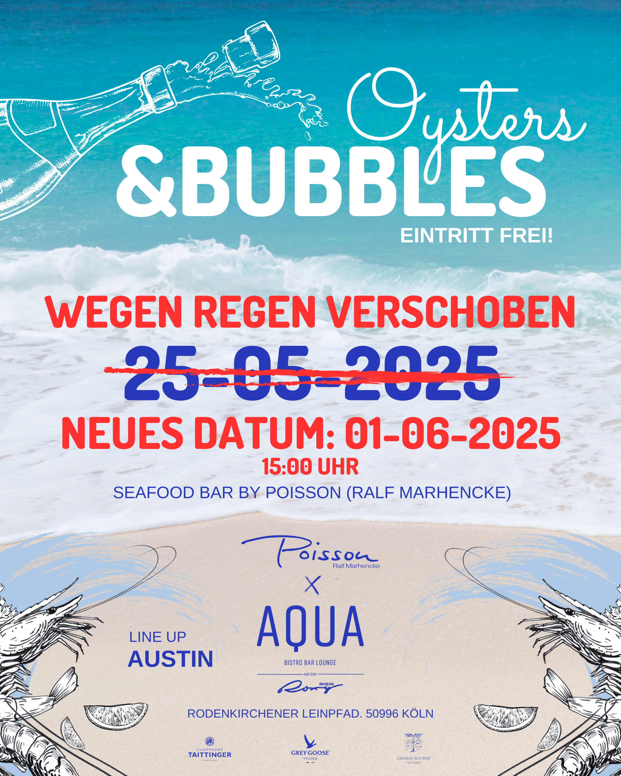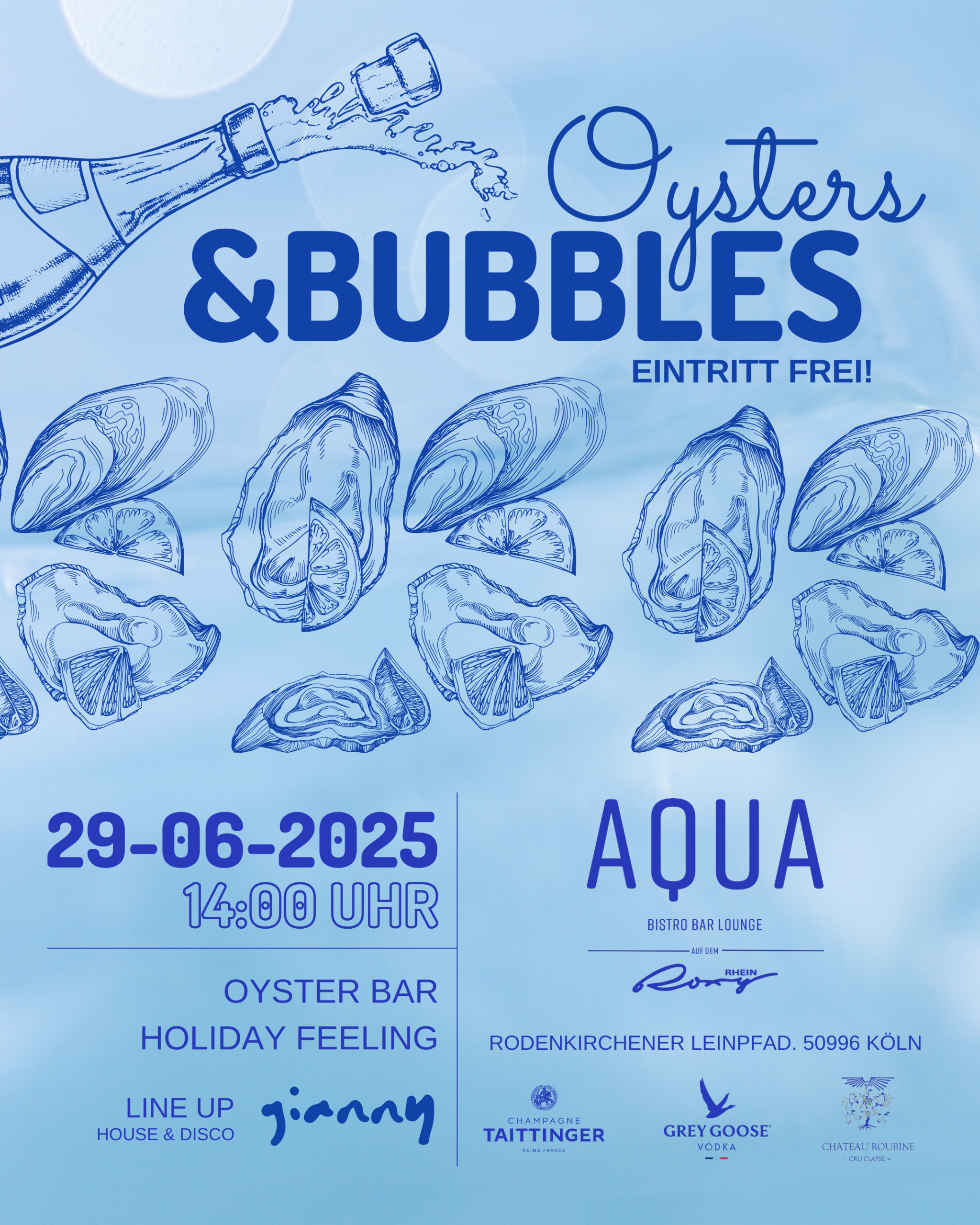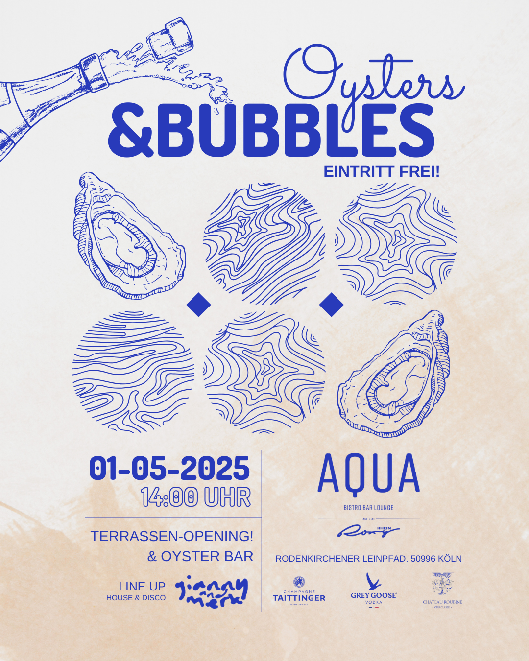 AQUA auf dem Eventschiff Rhein Roxy Heinrich Lübke Ufer, KölnWE ARE BACK! ☀️🍾 Die Sonne kommt raus, die Gläser werden gefüllt – am 1. Mai eröffnen wir offiziell die Terrassensaison! 🎉 Und wie könnte das besser starten als mit unserem absoluten Highlight: Oysters & Bubbles! 🦪🥂 Kommt vorbei, genießt feinste Austern, prickelnde Drinks und die beste Atmosphäre direkt am Rhein! Eintritt frei!